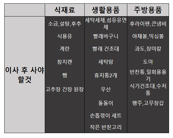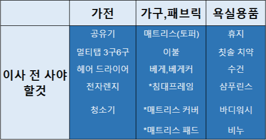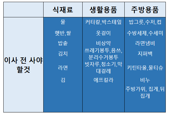 오늘은 제가 자취할 때 사야 할 필수품을 정렬해서 이사 전 이사 후로 나눠 목록을 만들어 보았습니다.